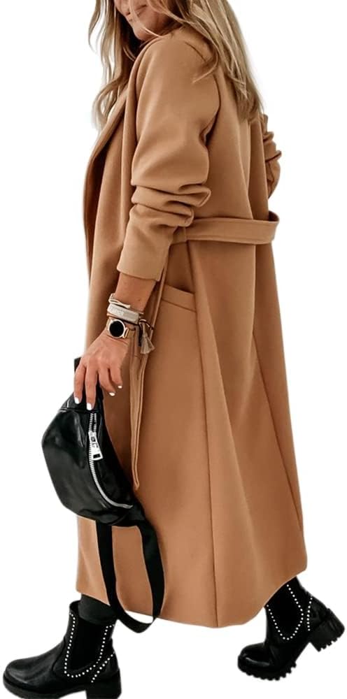 Womens Classic Coat Lapel Collar Open Front Belted Long Jacket
